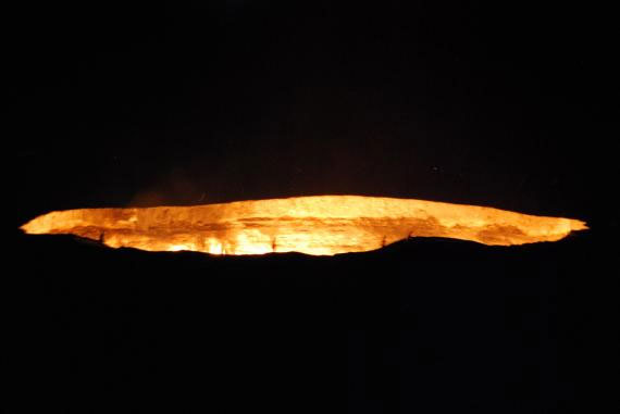 Đây là một hố gas tự nhiên có đường kính khoảng 99m, bốc cháy dữ dội suốt 40 năm qua. Năm 1971, trong một lần thăm dò địa chất tại sa mạc Karakum, Turkmenistan, các nhà địa chất Liên Xô đã khoan trúng một hang ngầm chứa khí gas tự nhiên. Lo ngại khí độc có thể bị giải phóng từ đây, các nhà địa chất quyết định châm lửa đốt hố và cho rằng, ngọn lửa sẽ tắt trong vài ngày. Tuy nhiên, trái với kỳ vọng của họ, do lượng khí gas quá nhiều nên hố vẫn bùng cháy cho đến ngày nay.