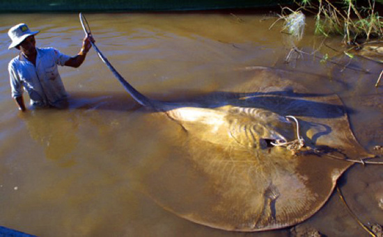 Cá đuối nước ngọt hay còn gọi là cá đuối gai độc thường sống ở các con sông thuộc khu vực Đông Nam Á. Có một thân hình dẹt như chiếc đĩa khổng lồ, loài cá này nổi tiếng không phải vì sự hung dữ hay những vụ tấn công con người, mà vì chất kịch độc nằm trong cái đuôi dài tới 0,2m. Chúng thường ẩn nấp dưới lớp bùn ở đáy sông và tấn công con mồi bằng chất độc ở đuôi tương tự như một con bọ cạp. Âm thầm và lặng lẽ kết thúc con mồi như một sát thủ thực sự, với chiều dài có thể lên đến 4m và trọng lượng khoảng 100kg.