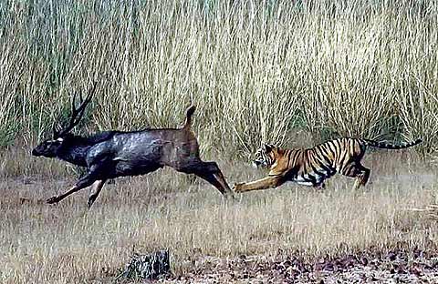 Con hổ đuổi theo con hươu châu Á tại khu bảo tồn thiên nhiên của bang Maharashtra, Ấn Độ. Ảnh: Barcroft India.