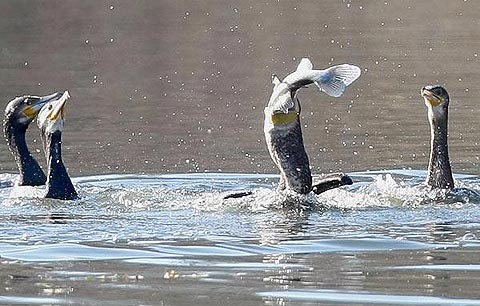 Con chim cốc đang cố nuốt con cá mà nó vừa bắt được, trong khi những con khác đứng nhìn ở Stuttgart, Đức. Ảnh: AP.