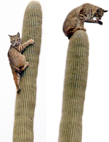 Đôi linh miêu vắt vẻo trên ngọn xương rồng ở Tucson, Arizona, Mỹ. Ảnh: AP.