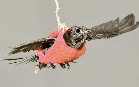 Con chim nhỏ lại có thể học bay lại nhờ bộ áo đặc biệt mà các nhân viên công viên hoang dã Ramat Gan ở Israel thiết kế cho sau khi nó bị thương và mất một cánh. Ảnh: REX FEATURES.