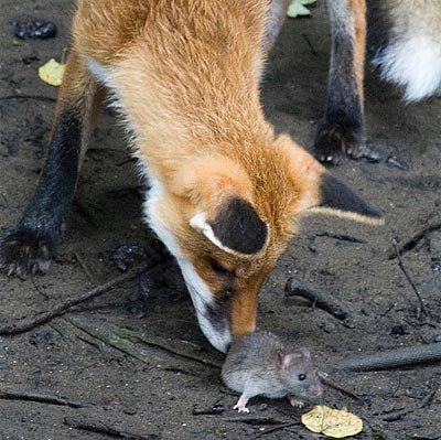 Con cáo thúc mõm vào người con chuột ở Dublin, Anh, hy vọng con vật bé nhỏ này chạy để nó tiếp tục chơi trò đuổi bắt, nhưng con chuột đờ người vì sợ. Ảnh: BARCROFT MEDIA.