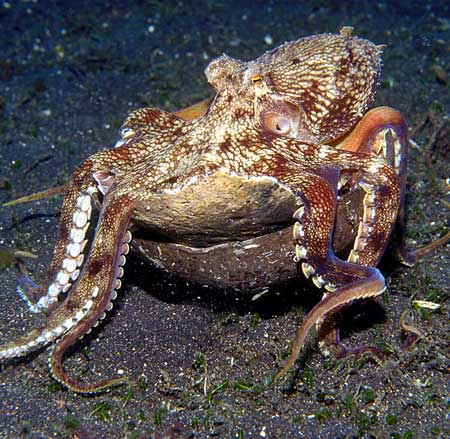 Bạch tuộc ôm theo nửa vỏ quả dừa lê dưới đáy biển ở Australia. Ảnh: AP. |