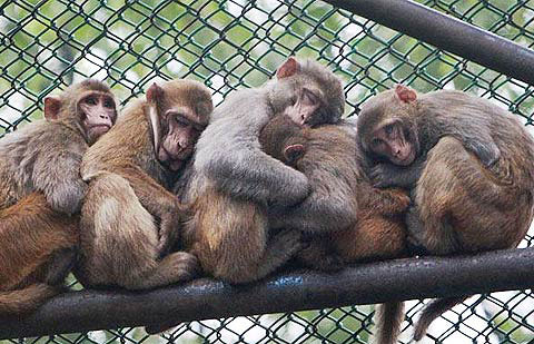 Khỉ ôm nhau tránh rét trong vườn thú Dhaka, Bangladesh. Ảnh: AP.