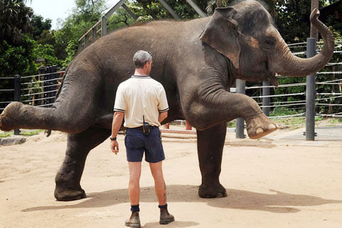 Nhân viên vườn thú Melbourne, Australia, hướng dẫn voi mẹ tập thể dục để sinh nở dễ dàng hơn. Ảnh: EPA.