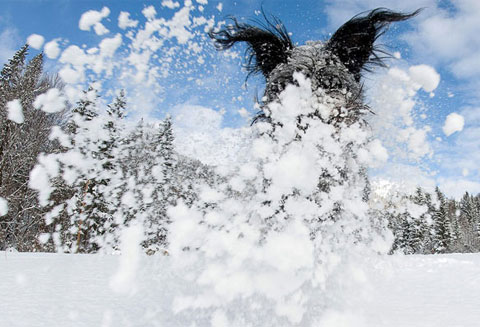 Chó Lotta chạy làm bung lên những bông tuyết trắng xóa ở Salzburg, Áo. Ảnh: AP.