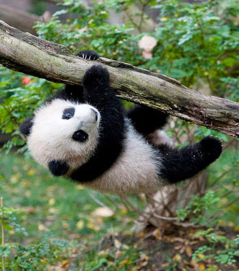 Gấu trúc con Yun Zi đu người trên cành cây trong lần đầu ra mắt ở vườn thú San Diego, California, Mỹ. Ảnh: Reuters.