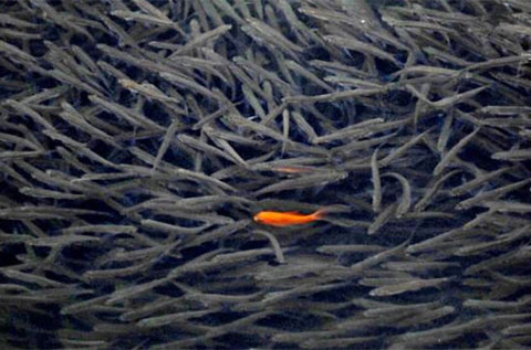 Một con cá vàng bơi giữa hàng nghìn con cá đen trong một công viên ở Hồ Bắc, Trung Quốc. Ảnh: BARCROFT. |