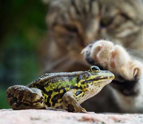Mèo vờn ếch tại thành phố Sieverdorf, Đức. Ảnh: AFP
