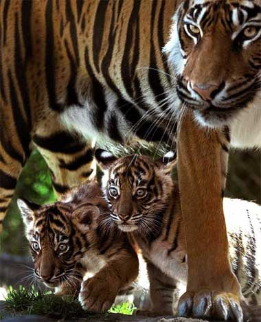 Hai chú hổ Sumatra con 8 tuần tuổi cùng mẹ trong vườn thú Point Defiance, Washington, Mỹ. Ảnh: AP