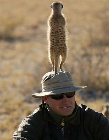 Con meerkat đứng trên đầu nhiếp ảnh gia Lee Whittam để quan sát khu vực xung quanh trong sa mạc Kalahari tại Botswana. Ảnh: Lee Whittam