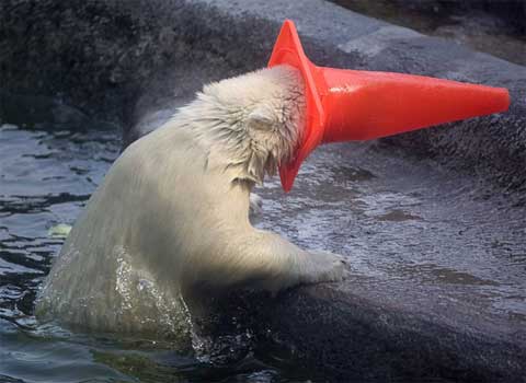 Gấu trắng trong vườn thú Matxcơva tìm ra cách giải trí độc đáo giữa đợt nóng kỷ lục trong 130 năm qua tại Nga. Ảnh: EPA