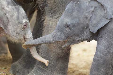 Hai chú voi con làm quen với nhau trong vườn thú Hanover, Đức. Ảnh: Rex Features