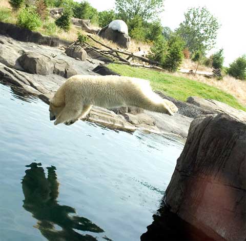 Gấu trắng lao xuống dòng nước trong vườn thú Columbus, thành phố Powell, bang Ohio, Mỹ. Ảnh: AP