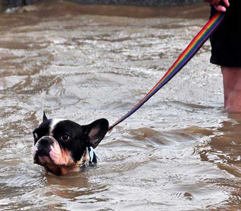 Con chó bơi trong nước lũ tại thành phố Vũ Hán, tỉnh Hồ Bắc, Trung Quốc. Ảnh: AP