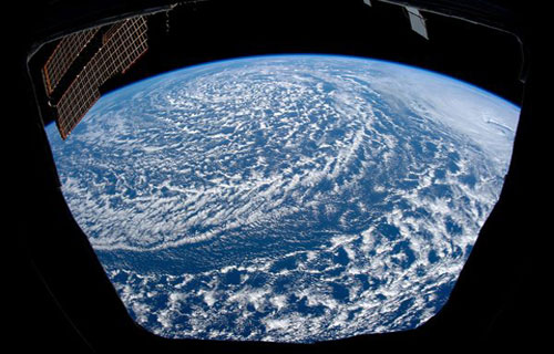 Mây tạo thành một đường xoáy khổng lồ phía trên Thái Bình Dương. Cảnh tượng này được chụp từ Trạm Không gian quốc tế.