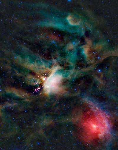 Nhiều kiểu tinh vân cùng tồn tại trong vùng tạo sao mang tên Rho Ophiuchi. Chẳng hạn, tinh vân màu trắng và hồng ở giữa bức ảnh phát sáng do bụi, khí của nó bị nung nóng bởi ngôi sao ở trung tâm. Ngược lại, tinh vân ở góc dưới bên phải phát ra ánh sáng màu đỏ do bụi, khí của nó phản chiếu ánh sáng từ ngôi sao ở giữa tinh vân.