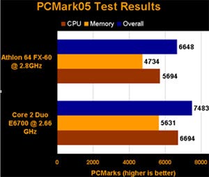 PCMark05 không có bất cứ tính năng tối ưu hóa nào cụ thể cho nền tảng vi kiến trúc Core vì nền tảng này vẫn chưa công bố khi PCMark05 được phát triển. Mặc dù vậy, điểm đánh giá lại rất ấn tượng. Bộ vi xử lý Core 2 Duo E6700 có tốc độ thấp hơn nhưng lại có điểm PCMark tổng thể và hiệu suất hoạt động của bộ vi xử lý tốt hơn bộ vi xử lý FX-60 đã được đôn xung. Chúng tôi không quá tin vào các điểm của bộ nhớ do hệ thống thử nghiệm của Intel sử dụng bộ nhớ DDR2 trong khi hệ thống thử nghiệm của AMD lại sử dụng bộ nhớ DDR. Hiện tại, các bộ vi xử lý của AMD đã hỗ trợ hoàn toàn bộ nhớ DDR2.