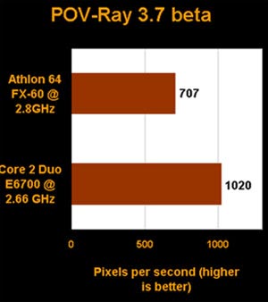 Phiên bản 3.7 của công cụ chồng hình mã nguồn mở POV-Ray hỗ trợ khả năng xử lý đa luồng và các lệnh SSE. Chúng tôi kích hoạt lựa chọn “all CPUs” (Tất cả các bộ vi xử lý) trong chương trình POV-Ray với phiên bản beta mới nhất (phiên bản 13) và ghi lại kết quả về Pixels Per Second (PPS-số lượng pixel trên mỗi giây).