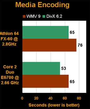 Bộ vi xử lý Core 2 Duo tiếp tục thể hiện hiệu suất hoạt động hàng đầu đầy ấn tượng. Bộ vi xử lý Core 2 Duo tốc độ 2,66GHz chạy ứng dụng thử nghiệm mã hóa DivX nhanh hơn 22% và ứng dụng WMV9 thì nhanh hơn 17%. Đây là những con số cực kỳ ấn tượng khi so sánh những bộ vi xử lý hơi khác nhau. Chúng tôi thực sự rất muốn so sánh bộ vi xử lý Core 2 Duo với bộ vi xử lý FX-62 thật sự, nhưng chúng tôi vẫn tin là sẽ không có sự khác biệt quá lớn nào xảy ra.