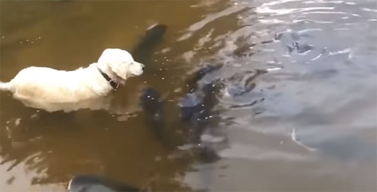 Rani sau đó đứng im bất động khi một đàn cá da trơn khổng lồ bơi xung quanh. Video cho thấy chú chó nhìn chằm chằm vào đám cá.