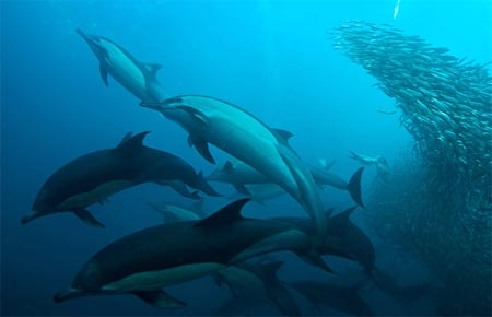 | Khoảng một nghìn con cá heo hợp tác lao tới để săn đuổi đàn cá sardine. |
