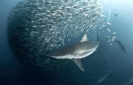 | Cảnh tượng được ví như màn săn mồi vĩ đại nhất trên trái đất, khi hàng đàn cá mập, cá voi, cá heo và chim trời bao vây hàng nghìn con cá sardine đang di cư từ vùng nước lạnh ở Nam Phi tới vùng nước ấm ở phía bắc. |