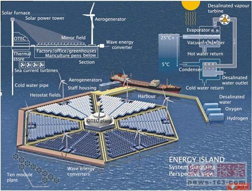 Đảo Năng lượng là sáng kiến của nhà phát minh Pháp Dominic Michaelis. Ông vốn bức xúc với công nghệ chuyển hóa nhiệt năng đại dương (ocean thermal energy conversion - OTEC) mà ông cho là chẳng có gì mới mẻ. Đảo Năng lượng, do Michaelis và con trai ông thiết kế, ở giữa có một nhà máy OTEC và dàn trải trên diện tích rộng 600 m2 cho phép lắp đặt hệ thống tua-bin gió và máy thu năng lượng Mặt trời.