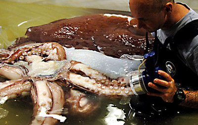 Mark Fenwick, chuyên viên kỹ thuật của bảo tàng Te Papa Museum, chiếu đèn vào mắt của con mực.