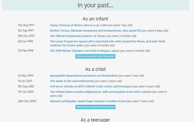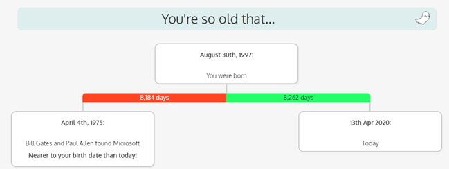 Trang web này sẽ cho bạn biết ngày mình sinh ra thế giới xung quanh có gì thú vị và từ đó đến nay đã từng xảy ra những sự kiện gì nổi bật. Đây là một trang web được tạo ra bởi nhóm vợ chồng Jolyon & Katya từ London, Vương quốc Anh, ra mắt vào 2/6/2014. Khi đó, cặp vợ chồng này vừa mới trở thành cha mẹ, trải nghiệm thú vị này khiến cả hai suy nghĩ về những gì đã xảy ra trong cuộc sống của họ từ lúc sinh ra đến bây giờ. Họ đã biến suy nghĩ này thành thực tế và trang web You're getting old! đã ra đời.