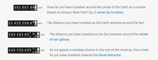 Tiếp đến bạn sẽ biết được những thông tin về tổng hành trình của những chuyến động của chúng ta và các vật thể trong vũ trụ bao la này, những con số này luôn chạy liên tục. Bạn đã đi bao xa quanh trung tâm Trái đất khi nó quay, khoảng cách bạn đã đi khi Trái đất xoay quanh Mặt trời, khoảng cách bạn đã đi khi Mặt trời xoay quanh trung tâm thiên hà...