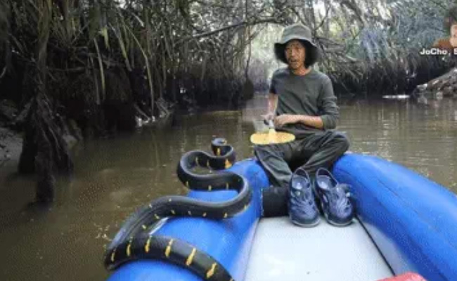Con rắn tỏ ra vô cùng hung hăng. Nó cuộn mình trong tư thế tấn công rồi lao về phía người đàn ông này. Nhưng rất may là người đàn ông đã không bị cắn trúng. Sau đó con rắn đã bỏ đi bằng cách bơi ra khỏi con thuyền.