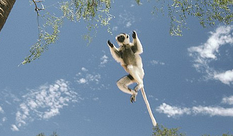 | Con vượn cáo tung người, nhảy từ cành cây này sang cây khác. Ảnh: Ảnh: National Graphic. |
