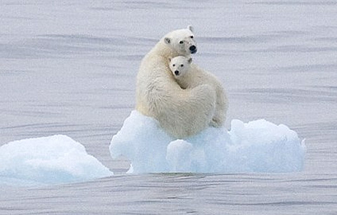 | Gấu trắng bắc cực ôm con trong lòng trên một mỏm băng. Ảnh: IRA Meyer. |