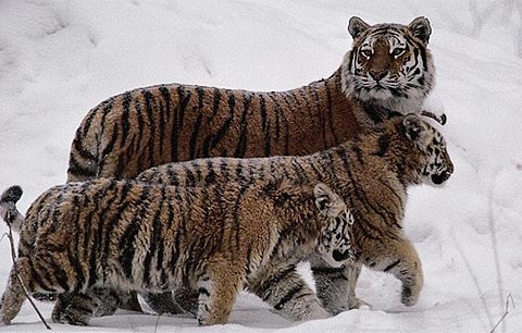 | Mẹ con nhà hổ thong dong trên mặt đất phủ đầy băng tuyết. Ảnh: National Graphic. |
