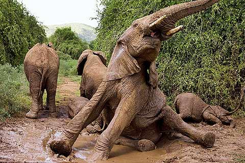 | Voi mẹ và voi con tận hưởng màn tắm bùn để làm mát trong tiết trời nóng bức. Ảnh: National Graphic. |