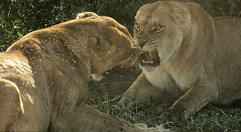 | Đôi sư tử cái hằm hè chuẩn bị lao vào nhau. Ảnh: Beverly Joubert. |