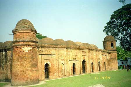 hình là giáo đường Shait Gumbad nổi tiếng về 77 mái vòm và phòng nguyện mênh mông, chia làm 7 hành lang.