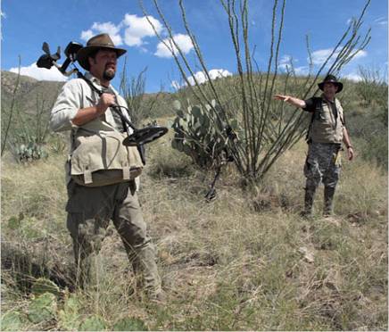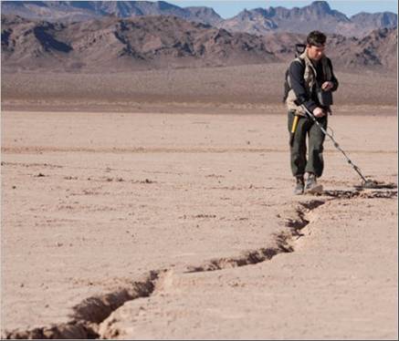 Dò tìm trên sa mạc. Geoffrey đang dùng thiết bị dò tìm kim loại để rà soát khu vực xung quanh vết nứt trên mặt đất.